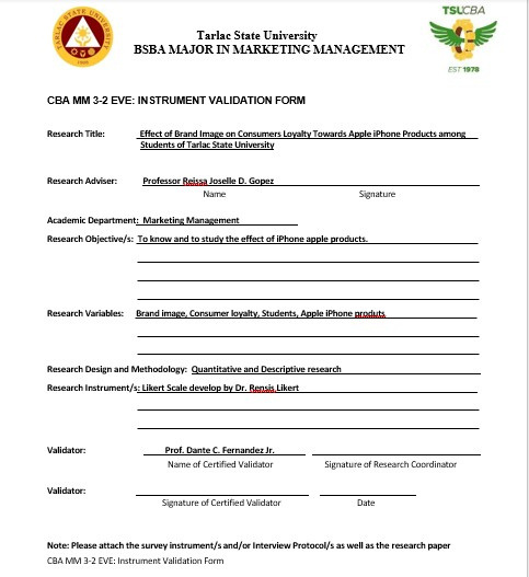 The instrument was validated by the faculty of Tarlac State University under Marketing Management. The Researchers validator was Professor Dante Fernandez